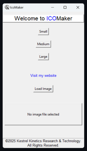 Convert to ICO: Generate ICO files in three sizes: 16×16, 64×64, and 256×256 pixels. User Friendly Interface: Easily select and convert images with a straightforward button layout. Website Access: Quick link to the developer’s website for support and updates. Supported Formats: Works with JPG, JPEG, and PNG formats.